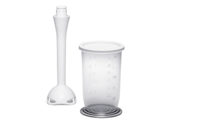 A compact multi-purpose hand mixer with a long blending attachment for quick, smooth kitchen prep.