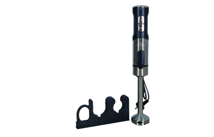 A 1200W hand blender with a sharp stainless-steel blade and an ergonomic anti-slip handle for quick, smooth blending.