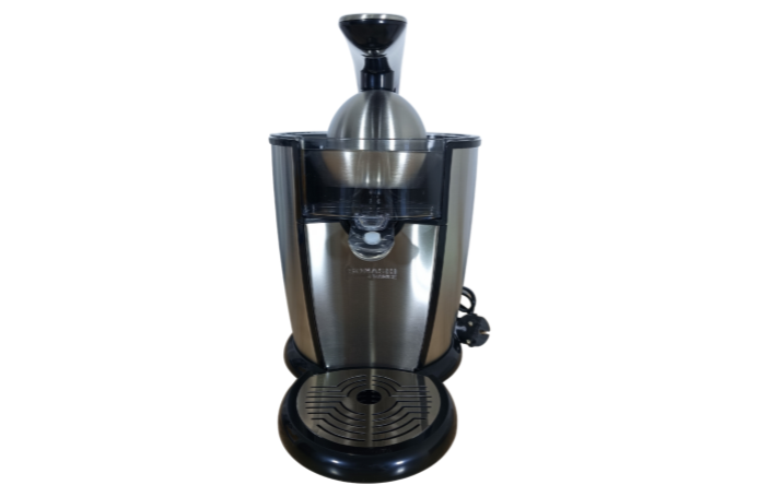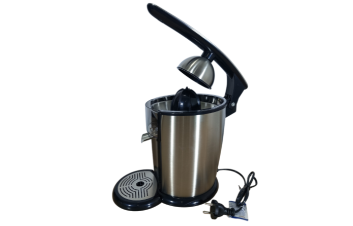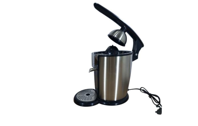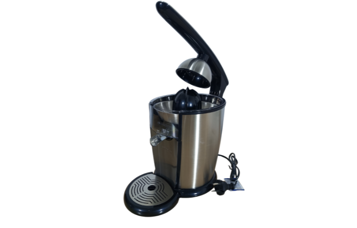 A stainless-steel citrus juicer with a lever-press mechanism designed for powerful extraction and easy, mess-free use.