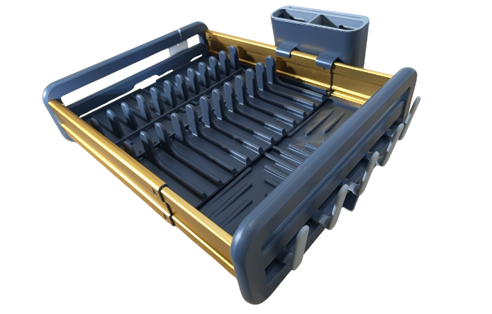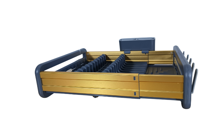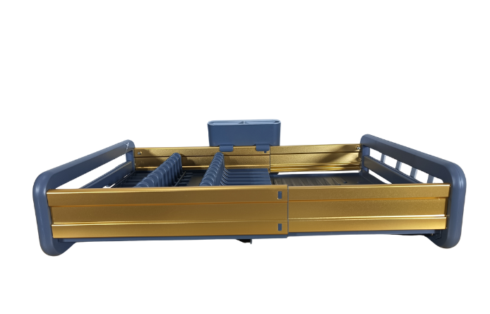 A stylish and durable aluminium dish rack designed to keep plates, cups, and utensils neatly organized.
