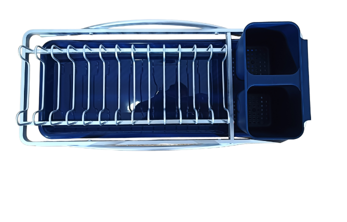 A durable aluminium dish rack designed for efficient drying and organized storage of plates, cups, and utensils.